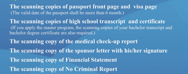 1.Senior high school graduation certificate (in Chinese or English, the copies should be notarized)