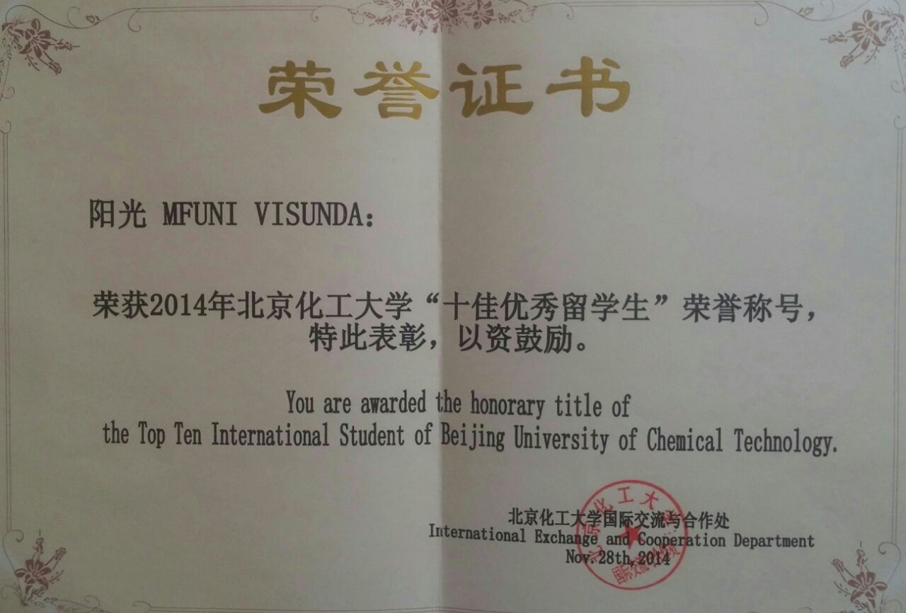 大家好!我是Visunda Mfuni,中文名字是阳光。我就是一个来自赞比亚充满阳光的大男孩。我已经在2016年毕业了。大家可以看我的毕业照。